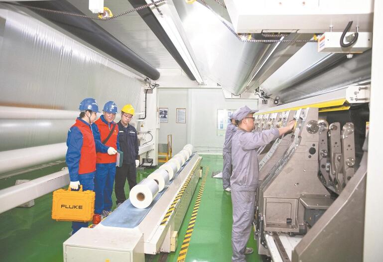 綿陽(yáng)供電公司員工在四川東材科技集團(tuán)股份有限公司為企業(yè)排查生產(chǎn)線用電安全隱患。田海 攝