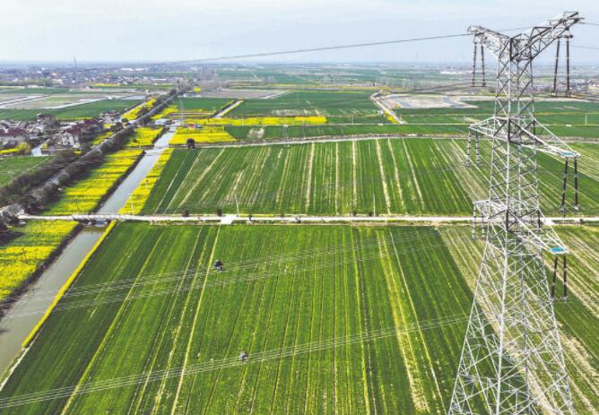 3月17日,在江蘇省興化市釣魚鎮(zhèn)徐海村,泰州供電公司檢修人員對(duì)500千伏州鳳線開(kāi)展高空走線,排查安全隱患,提升線路安全運(yùn)行水平。(湯德宏 攝)