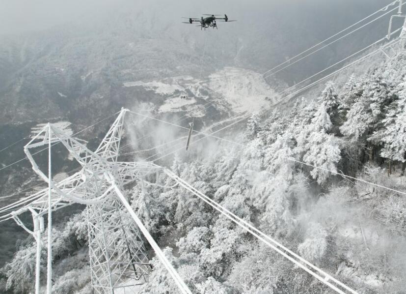 在海拔2800米的雅安市漢源縣蓑衣嶺,氣溫降至零下7℃,連接雅安至樂山的220千伏漢音輸電線路覆冰厚度已達10毫米。國網(wǎng)雅安供電公司組織電力運維人員持續(xù)開展冰情監(jiān)測,運用無人機搭載除冰裝置撞擊覆冰導(dǎo)線完成帶電除冰,及時消除輸電線路安全隱患。