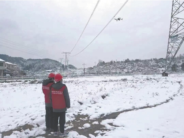 國(guó)網(wǎng)湖南電力員工開展無(wú)人機(jī)自適應(yīng)巡檢,完成防凍融冰保電工作任務(wù)。國(guó)網(wǎng)湖南電力供圖
