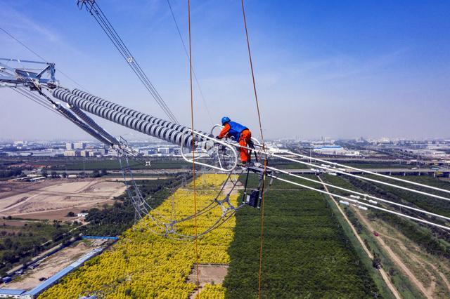國網天津電力工作人員在板濱500千伏線路工程現(xiàn)場開展高空走線作業(yè)。6月6日攝 國網天津電力供圖