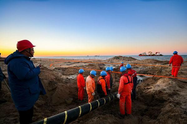 建設(shè)過程中,項(xiàng)目部始終貫徹安全第一的原則,施工前組織安全技術(shù)交底及班前會(huì),現(xiàn)場搭設(shè)工作圍欄及安全警示帶,設(shè)專職安全員保障現(xiàn)場安全。施工現(xiàn)場采用2臺(tái)布纜機(jī)與3臺(tái)挖掘機(jī)相配合的施工工藝保障海纜敷設(shè)路徑精度與進(jìn)度,確保220千伏海纜按要求完成敷設(shè)。經(jīng)過前期充分準(zhǔn)備和精心組織,項(xiàng)目部重點(diǎn)加強(qiáng)現(xiàn)場管理,及時(shí)根據(jù)天氣變化提研判施工準(zhǔn)備工作,針對(duì)可能出現(xiàn)的不利情況,重點(diǎn)加強(qiáng)沙灘段土質(zhì)松軟、電纜管口受漲潮影響后會(huì)出現(xiàn)積水、養(yǎng)殖戶民事糾紛等因素,加大組織技術(shù)人員研究土質(zhì)工作,充分準(zhǔn)備水泵、雨褲等設(shè)施用具,并設(shè)立專門民事人員等措施,進(jìn)一步順利保障了海纜敷設(shè)施工按期、保安全、高質(zhì)量的組織開展。