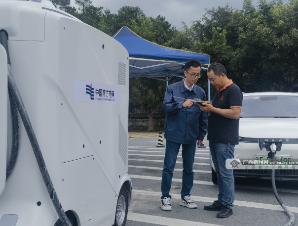 在G80廣昆高速容縣服務(wù)區(qū),南方電網(wǎng)廣西電網(wǎng)公司工作人員指引幫助返鄉(xiāng)群眾使用移動充電車充電。通訊員 董申頌 攝