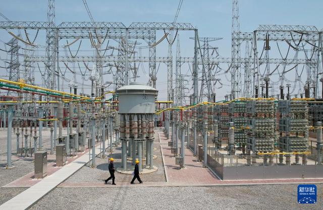 6月24日,工人在邢臺1000千伏特高壓變電站內巡查(無人機照片)。