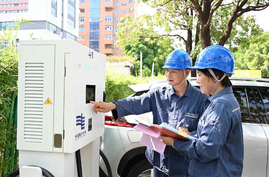 南方電網(wǎng)廣東佛山南海供電局工作人員正在檢查驗(yàn)收充電樁設(shè)備