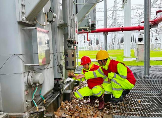 20日中午,在1000千伏練塘站,站長兼支部書記周勇趁著雨勢稍微減小再一次帶領(lǐng)運(yùn)維人員來到戶外設(shè)備區(qū)開展特巡,檢查特高壓主變運(yùn)行情況。連著中秋假期,周勇與站里的黨員們已經(jīng)連續(xù)奮戰(zhàn)了近一周,雖然很疲憊,但大家的目標(biāo)都是一致的——全力確保變電站可靠供電。
