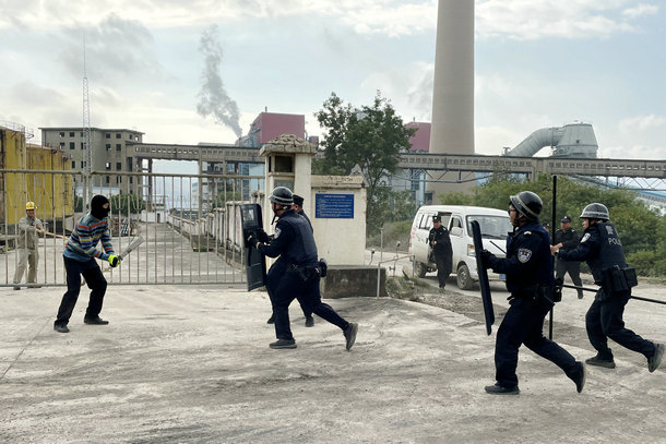 按照演習(xí)方案,兩名“假想嫌疑人”持器械翻越生產(chǎn)區(qū)域3號門,企圖闖入油泵房破壞生產(chǎn)設(shè)施。生產(chǎn)值班人員發(fā)現(xiàn)歹徒欲行闖入,立即上報(bào),同時(shí)進(jìn)行攔截。該公司應(yīng)急辦迅速啟動應(yīng)急預(yù)案,并向公安機(jī)關(guān)報(bào)警,要求出警支援。接到報(bào)警后,鎮(zhèn)派出所快速組織警力趕到事發(fā)現(xiàn)場,幾經(jīng)周旋,與公司內(nèi)保人員一起將“恐怖分子”控制抓捕。演練過程中,該公司各個(gè)部門反映迅速,配合默契,采取處置措施及時(shí)、合理、表現(xiàn)出良好的處理突發(fā)事件的能力。
