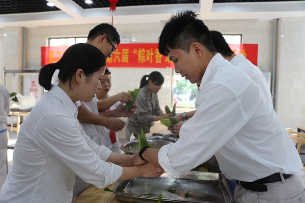 活動開始之前,該公司團委工作人員將提前一天準備好的粽葉、糯米、大棗、紅豆等材料整齊的擺在桌子上,活動開始后,大家互幫、互教、互學,圍在一起氛圍其樂融融。有經(jīng)驗的職工們手指翻飛間,一只只飽滿可愛的粽子出現(xiàn)在大家眼前,不會包的職工一邊學習老師傅一邊“創(chuàng)新”,做出的粽子也是奇行異狀,逗的大家哈哈大笑。