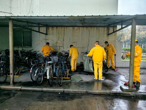 隨后,全體成員分為兩組分別對(duì)修舊利廢場(chǎng)地和自行車棚進(jìn)行分類、歸整和清掃。大家手抬肩扛,分工明確,將各項(xiàng)物資和自行車有序定置擺放。