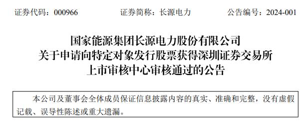 國(guó)家能源集團(tuán)長(zhǎng)源電力股份有限公司(簡(jiǎn)稱“長(zhǎng)源電力”)昨晚發(fā)布關(guān)于申請(qǐng)向特定對(duì)象發(fā)行股票獲得深圳證券交易所上市審核中心審核通過的公告。