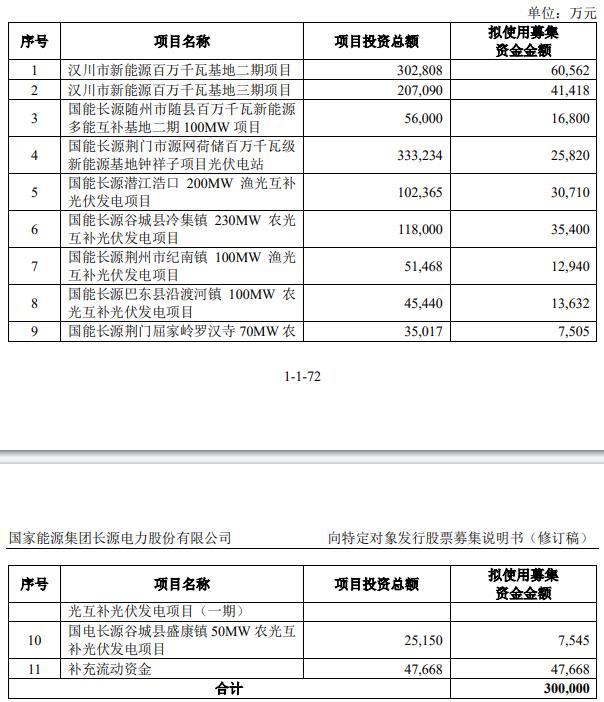 長(zhǎng)源電力向特定對(duì)象發(fā)行股票募集說(shuō)明書(修訂稿)(2023年三季度財(cái)務(wù)數(shù)據(jù)更新版)顯示,本次發(fā)行股票募集資金總額不超過300,000萬(wàn)元(含本數(shù)),扣除發(fā)行費(fèi)用后的募集資金凈額將用于漢川市新能源百萬(wàn)千瓦基地二期項(xiàng)目、漢川市新能源百萬(wàn)千瓦基地三期項(xiàng)目、國(guó)能長(zhǎng)源隨州市隨縣百萬(wàn)千瓦新能源多能互補(bǔ)基地二期100MW項(xiàng)目、國(guó)能長(zhǎng)源荊門市源網(wǎng)荷儲(chǔ)百萬(wàn)千瓦級(jí)新能源基地鐘祥子項(xiàng)目光伏電站、國(guó)能長(zhǎng)源潛江浩口200MW漁光互補(bǔ)光伏發(fā)電項(xiàng)目、國(guó)能長(zhǎng)源谷城縣冷集鎮(zhèn)230MW農(nóng)光互補(bǔ)光伏發(fā)電項(xiàng)目、國(guó)能長(zhǎng)源荊州市紀(jì)南鎮(zhèn)100MW漁光互補(bǔ)光伏發(fā)電項(xiàng)目、國(guó)能長(zhǎng)源巴東縣沿渡河鎮(zhèn)100MW農(nóng)光互補(bǔ)光伏發(fā)電項(xiàng)目、國(guó)能長(zhǎng)源荊門屈家?guī)X羅漢寺70MW農(nóng)光互補(bǔ)光伏發(fā)電項(xiàng)目(一期)、國(guó)電長(zhǎng)源谷城縣盛康鎮(zhèn)50MW農(nóng)光互補(bǔ)光伏發(fā)電項(xiàng)目、補(bǔ)充流動(dòng)資金。