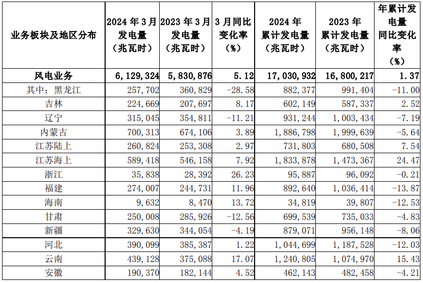 龍源電力4月8日公告,2024年3月按合并報表口徑完成發(fā)電量7,758,084兆瓦時,較2023年同期同比增長13.34%。其中,風(fēng)電發(fā)電量增長5.12%,火電發(fā)電量增長17.74%,其他可再生能源發(fā)電量增長236.24%。