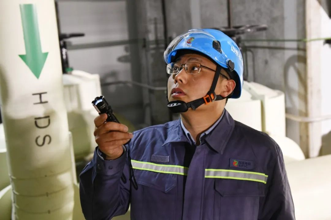 ▲張記剛在海陽核電2號機(jī)組常規(guī)島廠房開展設(shè)備故障排查和分析。