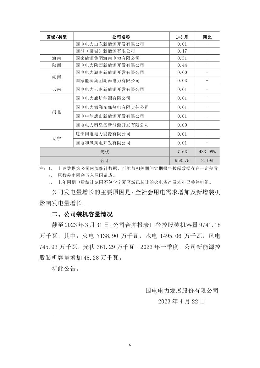 國(guó)電電力日前發(fā)布2023年一季度電量情況。2023年一季度公司合并報(bào)表口徑完成發(fā)電量1012.01億千瓦時(shí),上網(wǎng)電量958.75億千瓦時(shí),較上年同期分別下降5.39%和5.50%;按照可比口徑較上年同期分別增長(zhǎng)2.52%和2.19%。