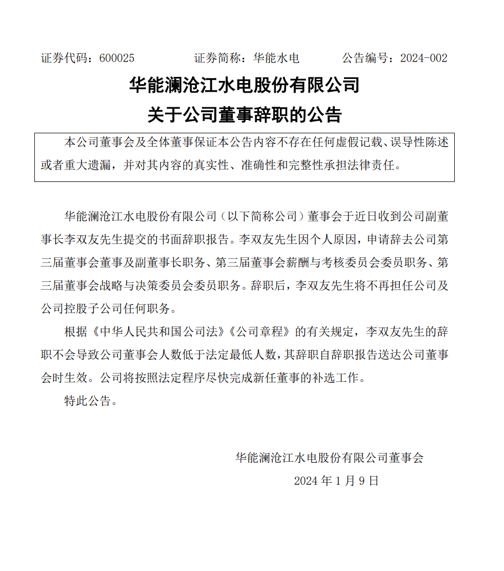 1月9日,華能水電發(fā)布公告稱,公司董事會于近日收到公司副董事長李雙友先生提交的書面辭職報告。李雙友先生因個人原因,申請辭去公司第三屆董事會董事及副董事長職務(wù)、第三屆董事會薪酬與考核委員會委員職務(wù)、第三屆董事會戰(zhàn)略與決策委員會委員職務(wù)。辭職后,李雙友先生將不再擔任公司及公司控股子公司任何職務(wù)。