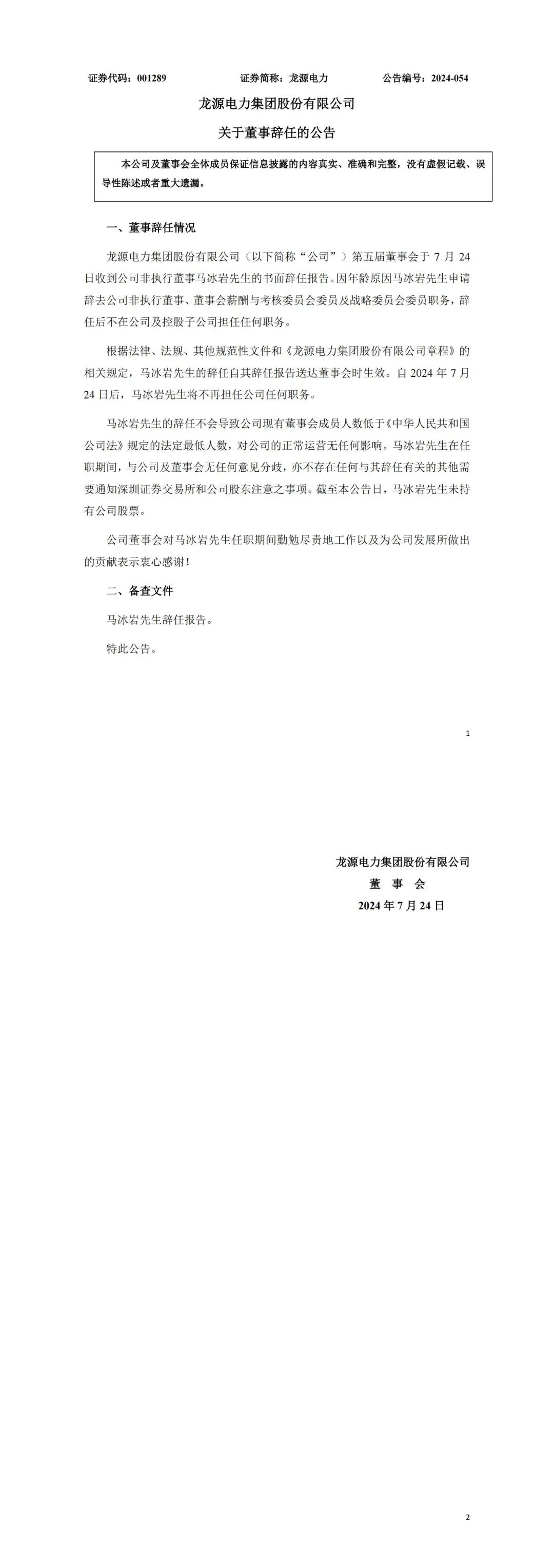 龍源電力集團股份有限公司發(fā)布公告稱,第五屆董事會于7月24日收到公司非執(zhí)行董事馬冰巖先生的書面辭任報告。因年齡原因馬冰巖先生申請辭去公司非執(zhí)行董事、董事會薪酬與考核委員會委員及戰(zhàn)略委員會委員職務(wù),辭任后不在公司及控股子公司擔(dān)任任何職務(wù)。