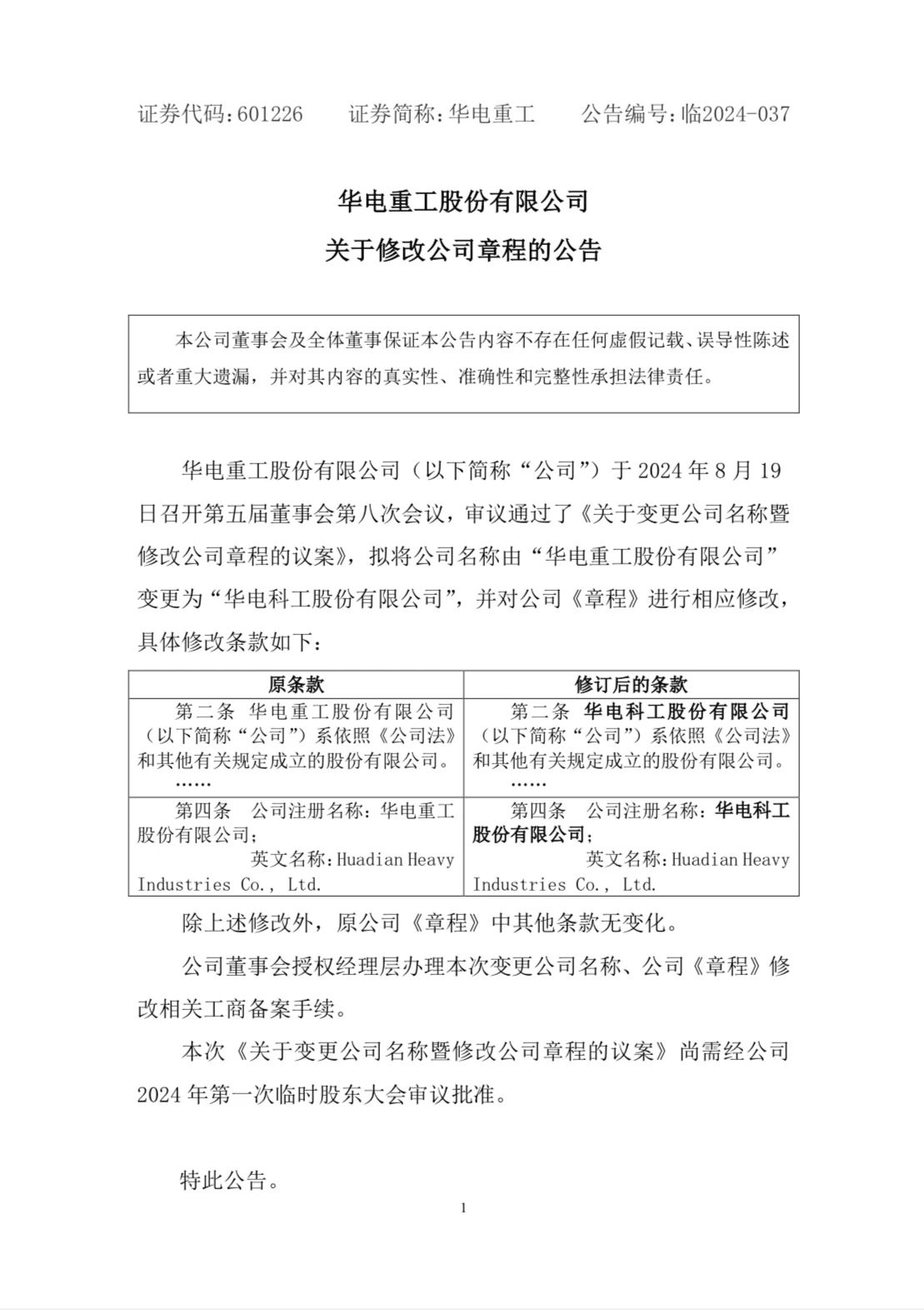 8月20日,華電重工發(fā)布公告稱,公司于2024年8月19日召開第五屆董事會(huì)第八次會(huì)議,以9票同意、0票反對(duì)、0票棄權(quán)的結(jié)果,審議通過(guò)了《關(guān)于變更公司名稱暨修改公司章程的議案》, 擬將公司中文全稱由“華電重工股份有限公司”變更為“華電科工股 份有限公司”,英文全稱保持不變。