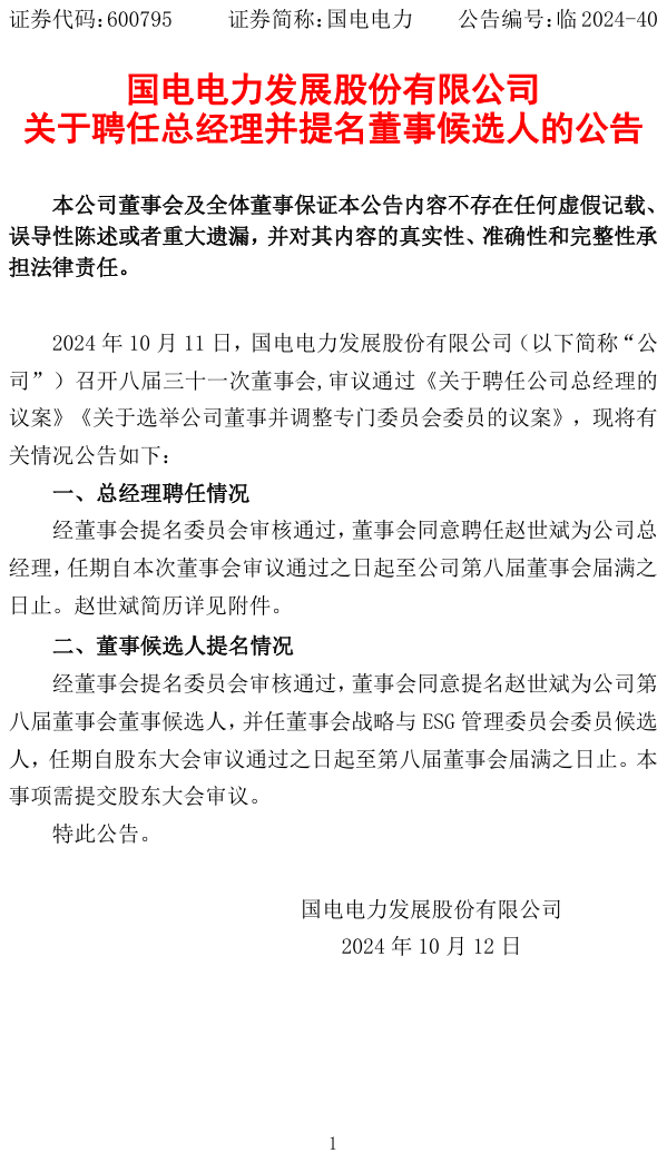 2024年10月11日,國電電力召開八屆三十一次董事會(huì),審議通過《關(guān)于聘任公司總經(jīng)理的議案》《關(guān)于選舉公司董事并調(diào)整專門委員會(huì)委員的議案》。經(jīng)董事會(huì)提名委員會(huì)審核通過,董事會(huì)同意聘任趙世斌為公司總經(jīng)理,任期自本次董事會(huì)審議通過之日起至公司第八屆董事會(huì)屆滿之日止。經(jīng)董事會(huì)提名委員會(huì)審核通過,董事會(huì)同意提名趙世斌為公司第八屆董事會(huì)董事候選人,并任董事會(huì)戰(zhàn)略與ESG管理委員會(huì)委員候選人,任期自股東大會(huì)審議通過之日起至第八屆董事會(huì)屆滿之日止。