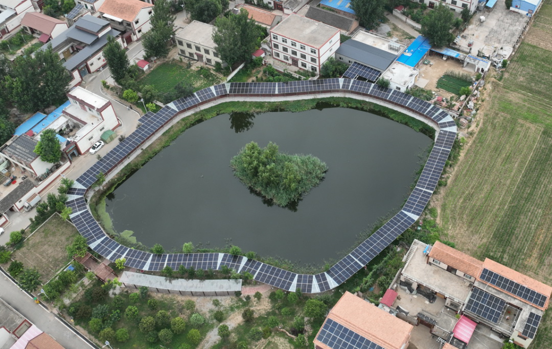 ▲河南省蘭考縣付樓村利用坑塘周?chē)鷧^(qū)域搭建光伏長(zhǎng)廊