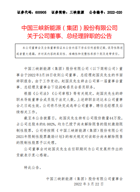 3月21日,三峽能源發(fā)布公告稱,公司董事會于3月18日收到公司董事、總經理趙國慶的書面辭職報告,由于工作變動,趙國慶先生辭去公司第一屆董事會董事、總經理及董事會下設戰(zhàn)略委員會委員職務。