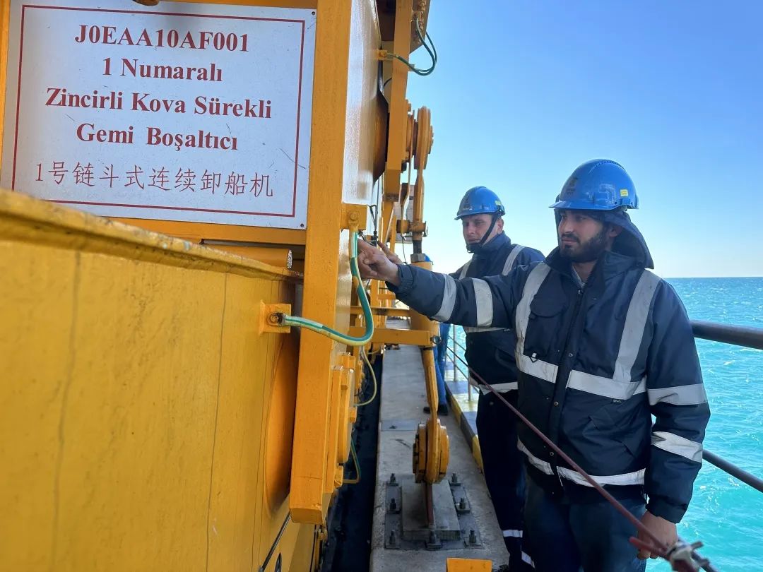 上海電力土耳其胡努特魯電廠員工正檢查卸船機工作情況