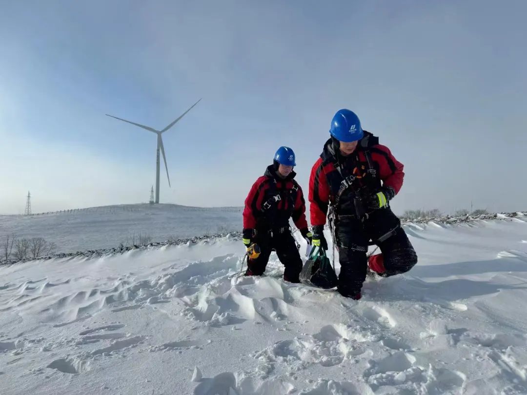在最高氣溫只有零下26攝氏度河北張家口沽源縣,華電冀北新能源馳盛風(fēng)電場的運維員工,正冒著寒風(fēng)對輸配電線路進行特巡,及時啟動極寒天氣應(yīng)急預(yù)案,通過“可視化+無人機+人工巡檢”的方式,開展線路及站內(nèi)設(shè)備特巡,加強設(shè)備監(jiān)控和消缺。