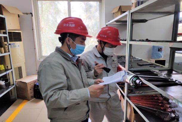 圖為該公司督查小組正在查看外委單位工器具臺(tái)賬記錄