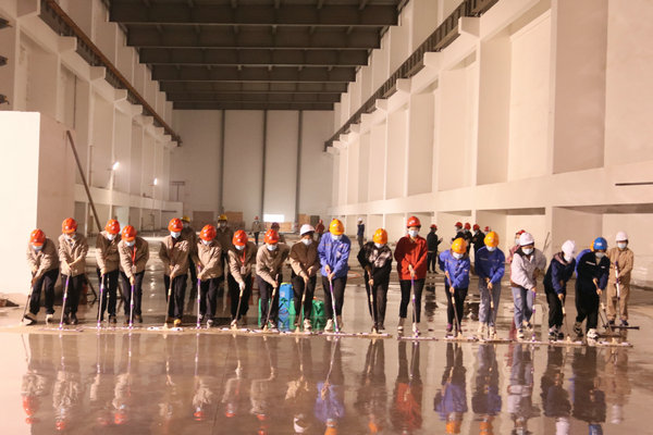在到達位于汽機房17米平臺的GIS室后,女職工明確分工,協(xié)同配合,裝水、噴水、清掃、沖水、拖地……分區(qū)域、分小組地對GIS室地面進行清潔。當大家看著地面從塵土漫漫逐漸變成干凈整潔的地面,干凈的面龐已是塵土夾雜著汗水,臉上的笑容依舊如初,勞動的成就感,為工程建設作出力所能及貢獻的自豪感充溢著大家的內(nèi)心。經(jīng)過兩個多小時的勞動,順利完成了600平方米GIS室地面的清潔。