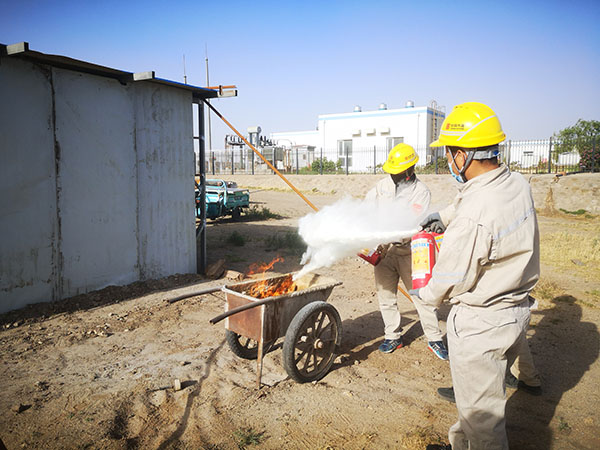 首先開展的是干粉滅火器實操演練。運(yùn)維人員取出4具即將送檢的滅火器,用小推車裝好干柴放置在空曠地點(diǎn),駐站人員講解了滅火器檢查方法和使用流程后,在確保安全的情況下將小推車內(nèi)的干柴點(diǎn)燃。一名工作人員用滅火器將車內(nèi)的火焰撲滅,再重新點(diǎn)燃,下一名人員繼續(xù)操作,最終達(dá)到參訓(xùn)人員全部能夠熟練使用滅火器的目的;其次,開展正壓呼吸器使用實操演練。在每個人都熟練掌握說明書上使用步驟和注意事項后,每名工作人員都穿戴正壓呼吸器一次,如果穿戴流程錯誤立即糾正并重新穿戴;再次,開展消防戰(zhàn)斗服穿戴實操演練。有火電消防工作經(jīng)驗的人員對戰(zhàn)斗服使用步驟進(jìn)行詳細(xì)講解,每名工作人員都穿戴消防戰(zhàn)斗服一次,達(dá)到全員均能熟練穿戴的目的;最后,所有參訓(xùn)人員都組裝并佩戴防毒面具一次。