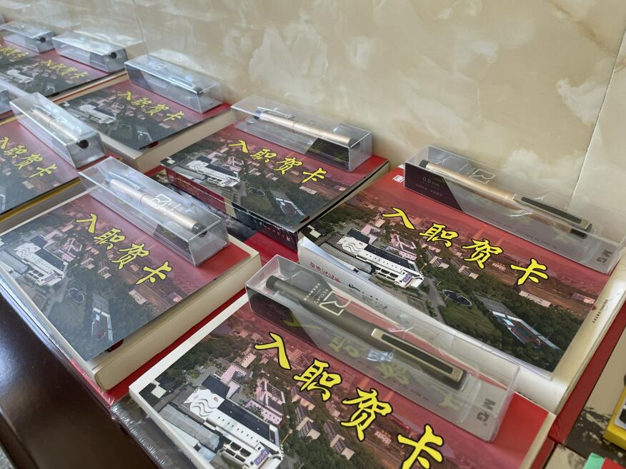 活動(dòng)現(xiàn)場(chǎng),該公司領(lǐng)導(dǎo)為新員工發(fā)放“入職賀卡”“入職學(xué)習(xí)大禮包”并與他們合影留念。(周佩)