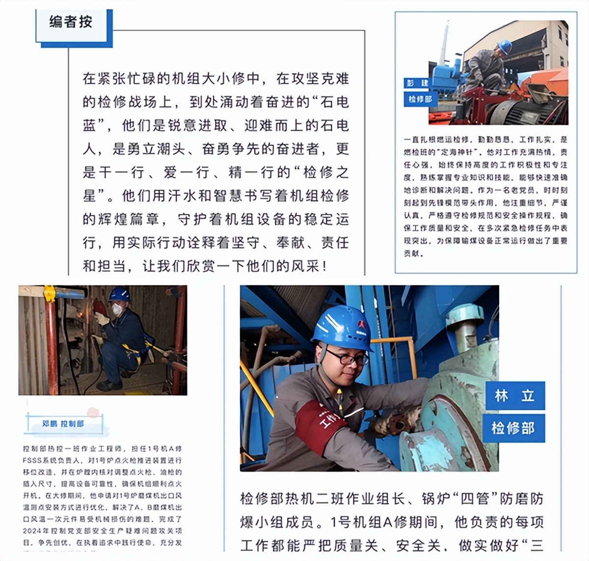 榜樣是精神、是力量。為大力宣揚機組檢修期間的先進典型和優(yōu)秀事跡,該公司在檢修班組間開展“檢修之星”評比活動,以“檢修之星”的楷模表率,激發(fā)檢修班組員工比學趕超、奮勇爭先的熱情和干勁。為確保“檢修之星”評選工作取得實效,該公司制定了“檢修之星”評選方法,明確了評星必備條件、主要指標以及評選過程,“檢修之星”的人選由檢修班組各推選一名,條件是能夠按質按量完成工作任務,在機組大小修中表現(xiàn)出色,能夠起到模范帶頭作用的人員。經綜合評選,該公司共評選出10名“檢修之星”員工,并通過企業(yè)網站、微信公眾號、宣傳展板等進行集中宣傳展示。