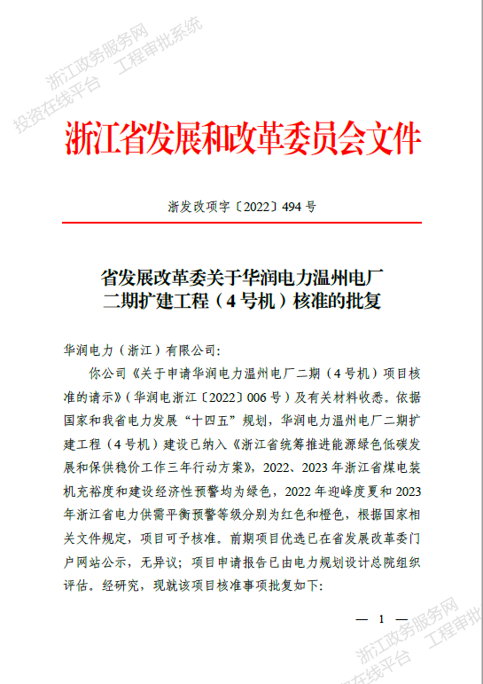 11月8日,華潤電力浙江公司溫州電廠4號機(jī)正式獲得浙江省發(fā)展和改革委員會(huì)核準(zhǔn)批復(fù)。
