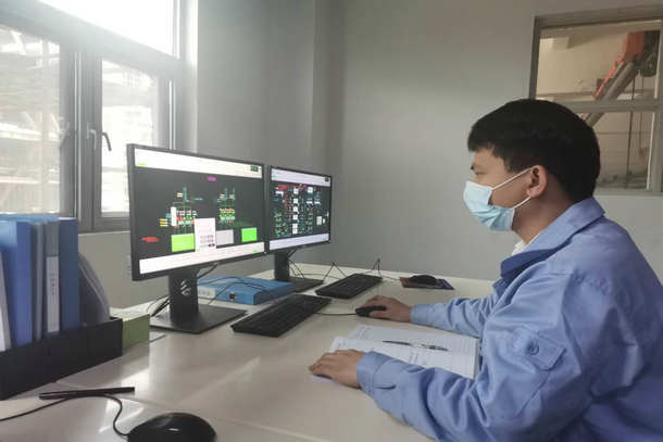 圖為接班人員在對廠前區(qū)系統(tǒng)監(jiān)盤