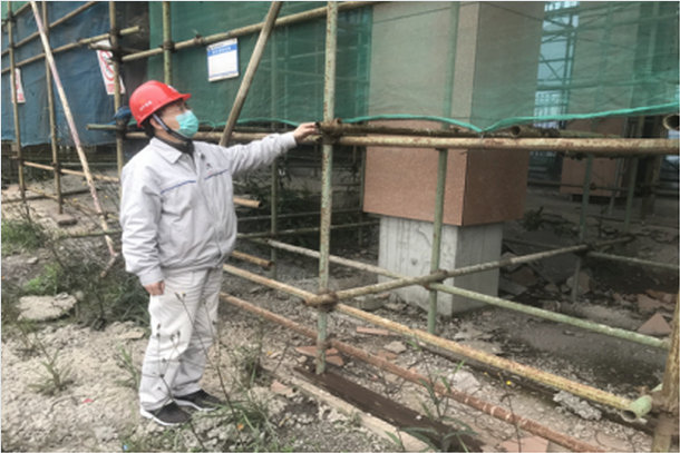 圖為安健環(huán)監(jiān)察部值班人員檢查現(xiàn)場腳手架