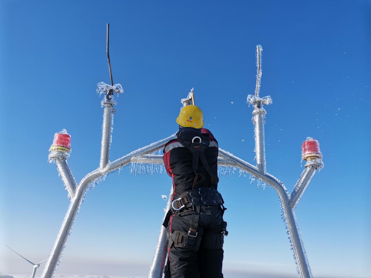 11月11日至12日,陽光透過薄薄的云層,照耀著白茫茫的大地,反射出銀色的光芒。風(fēng)機(jī)逐漸恢復(fù)運(yùn)行,在重力和風(fēng)機(jī)葉片旋轉(zhuǎn)的作用下,裹冰會(huì)從葉片上脫落,由于受旋轉(zhuǎn)葉片的離心力作用,這些冰在沒有障礙物遮擋的情況下會(huì)被拋出數(shù)百米遠(yuǎn),存在安全隱患。風(fēng)電場隨即組織人員挨家挨戶告訴村民,近期不得靠近風(fēng)機(jī),注意人身安全。之后開展機(jī)組風(fēng)速儀、風(fēng)向標(biāo)除冰工作,全面降低機(jī)組不可用時(shí)間,保障機(jī)組供電穩(wěn)定可靠。本次除冰消缺充分利用上海電氣風(fēng)機(jī)監(jiān)控系統(tǒng)后臺(tái),通過對(duì)比機(jī)組風(fēng)速和風(fēng)向、功率等數(shù)據(jù),分析判斷機(jī)組覆冰情況,對(duì)因雨雪冰凍天氣導(dǎo)致的風(fēng)速儀、風(fēng)向標(biāo)覆冰從而影響機(jī)組功率的問題,及時(shí)派出“破冰突擊隊(duì)”。但是機(jī)艙頂部由于積雪、結(jié)冰,變得十分光滑。工作人員佩戴好安全帶,掛好雙鉤,迎難而上,勇敢破冰。同時(shí)也對(duì)加熱器、溫度傳感器及相關(guān)回路進(jìn)行細(xì)致檢查,對(duì)無法正常運(yùn)行的加熱器進(jìn)行及時(shí)更換,確保設(shè)備加熱良好,回路接線無松動(dòng),風(fēng)速儀、風(fēng)向標(biāo)工作正常。