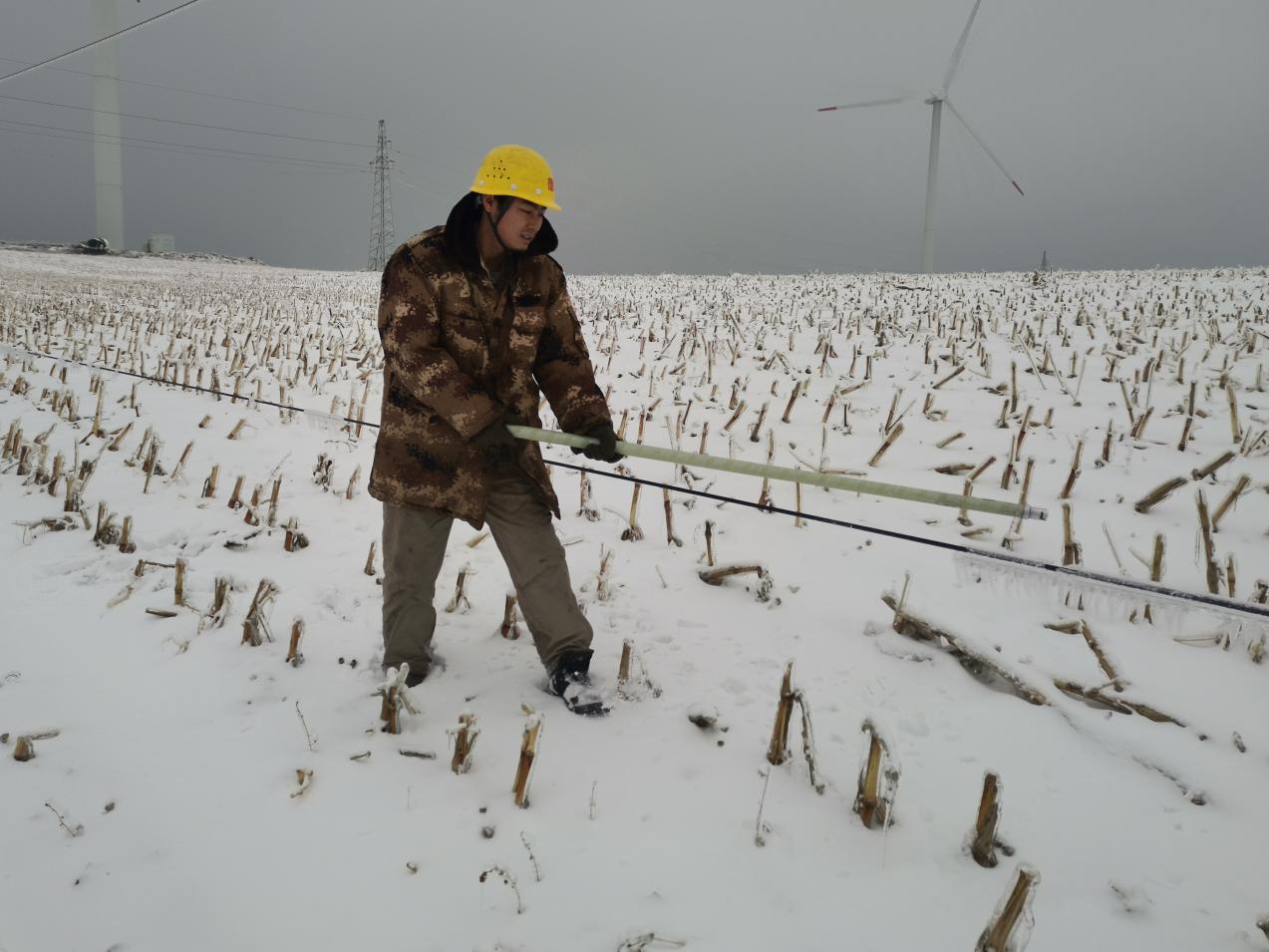 11月10日,瑟瑟寒風(fēng)能吹開地上的積雪,卻無法阻止破冰小隊(duì)的腳步。這場持續(xù)兩天的雨雪剛一停,風(fēng)電場立即組織人員兵分兩路,迅速趕往現(xiàn)場。一組對(duì)升壓站35kV側(cè)通訊光纖、220kV側(cè)高壓一次設(shè)備采取人工打冰的方式對(duì)覆冰部位進(jìn)行處理,確保線路安全,以及再對(duì)升壓站電纜溝蓋板進(jìn)行清掃。另一組首先對(duì)風(fēng)機(jī)變頻器冷卻風(fēng)扇散熱網(wǎng)上的“冰罩”進(jìn)行破冰。避免風(fēng)機(jī)復(fù)位運(yùn)行后,變頻器冷卻風(fēng)扇散熱不及時(shí)的情況,導(dǎo)致設(shè)備損壞。之后再對(duì)線路進(jìn)行檢查,因受大風(fēng)和凍雨混合雙打,集電線路被冰包裹得嚴(yán)嚴(yán)實(shí)實(shí)的。經(jīng)檢查后并無損壞,否則電線結(jié)冰后,既要承受冰掛的重量,加上風(fēng)的影響,致使電線被壓斷。同時(shí),電塔也可能會(huì)承受較往常多十幾倍的電線重量,從而造成傾倒或折斷。還好只是塔架固定掉落,加上冰的重量才“葛優(yōu)躺”在地面上?,F(xiàn)場用絕緣桿進(jìn)行人工敲打。隨著敲打的進(jìn)行,電纜逐漸升起,這也減少了發(fā)生事故的可能。