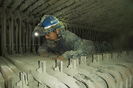 管排余溫散發(fā)熱浪,動一下粉塵便像揚沙一樣落下,眼前一片迷離。借著爐膛內(nèi)頭燈的照明,能清晰看到在他們睫毛上落定的塵埃......