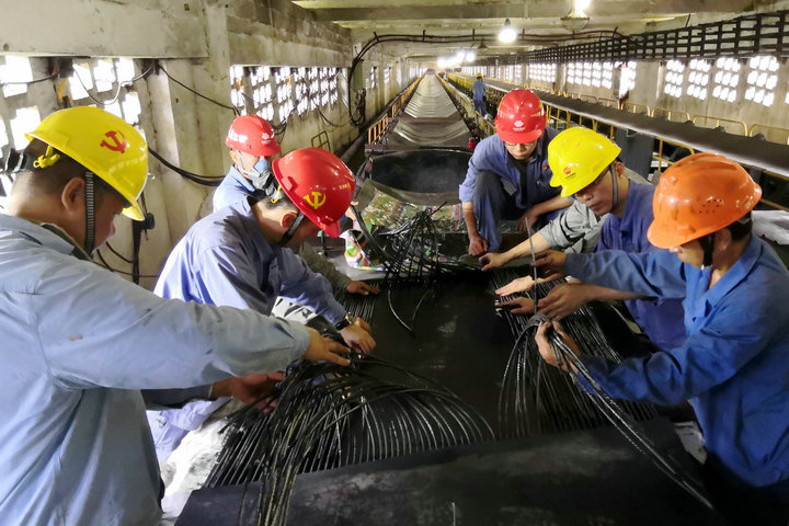 P106B膠帶整體更換膠帶全長2300米,共需硫化接頭20個,是整個輸煤系統(tǒng)膠帶更換工作中最難啃的一塊"硬骨頭"。為確保此次膠帶更換工作順利完成,該公司多次召開檢修專題討論會,制定了組織、安全、技術(shù)措施及詳細(xì)的施工方案,成立兩個硫化組,一個物資保障收放組,實(shí)行24小時輪班作業(yè),保證施工的持續(xù)性和連貫性。針對舊膠帶的拆除、拖拽、新膠帶的吊裝、鋪設(shè)等施工難點(diǎn),創(chuàng)新工作思路,開展技術(shù)攻關(guān)破解難題,自制了自動卷帶機(jī),減少了人工投入,極大提高了工作效率,特別是在攻克硫化接頭方面,嚴(yán)格施工標(biāo)準(zhǔn)和工藝流程操作,經(jīng)過斷帶、剝鋼絲繩、芯膠面膠鋪整、硫化機(jī)緊固、加壓、加熱、再進(jìn)行保溫降溫等施工程序,每個頭用時8多個小時,做到精益求精,確保一次硫化成功,保證硫化質(zhì)量。