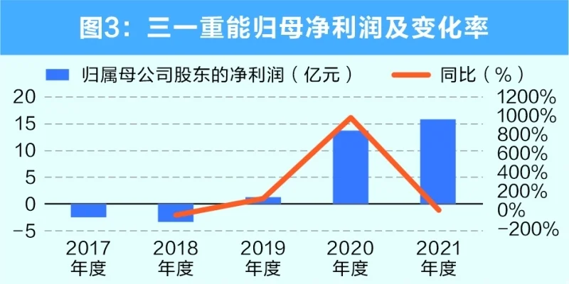 營業(yè)收入的高增長也帶來了三一重能盈利能力的快速提升。2019年至2021年,公司實現(xiàn)歸屬于母公司所有者的凈利潤1.26億元、13.72億元和15.91億元,增速分別為137.19%、992.53%和16.01%(見圖)。