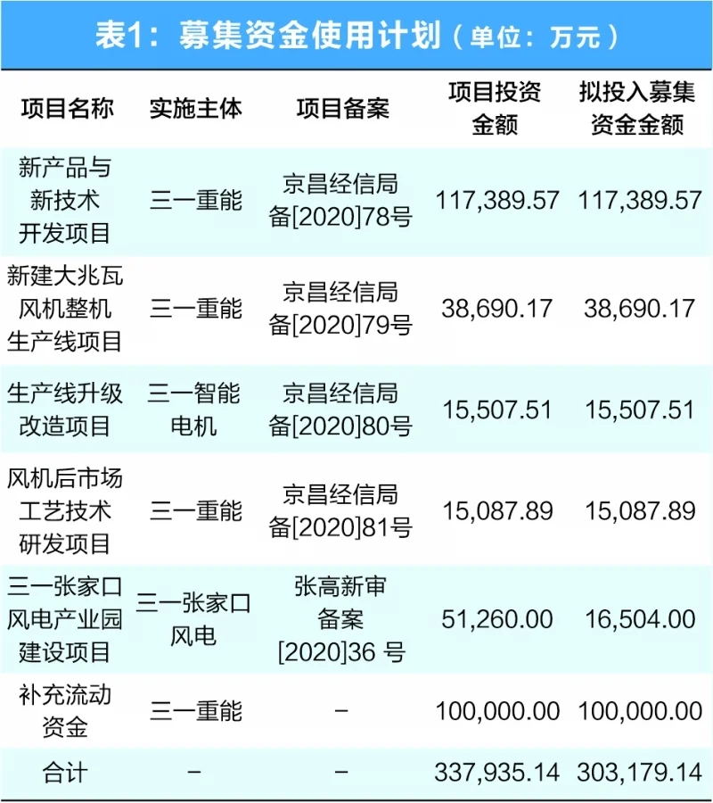 資料顯示,三一重能擬投入30.32億元募集資金用于風機產(chǎn)品相關(guān)技術(shù)的開發(fā)。募集資金投資項目主要投資方向圍繞風機產(chǎn)品、核心零部件、后市場服務等相關(guān)領(lǐng)域開展技術(shù)研發(fā)、產(chǎn)線升級、產(chǎn)能擴建,符合重點投向科技創(chuàng)新領(lǐng)域的要求。預期項目建成后將擴大公司在未來大兆瓦風力發(fā)電機市場上的占有率,從而保持市場競爭優(yōu)勢(見表)。