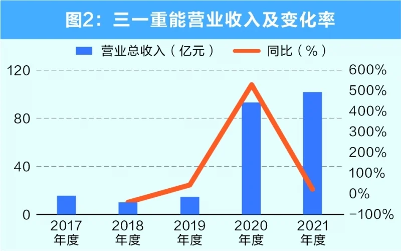 得益于風電行業(yè)整體的快速發(fā)展,以及公司自身產(chǎn)品的逐步成熟,及補貼退坡前的風電搶裝潮驅(qū)動,三一重能業(yè)務規(guī)模呈現(xiàn)跨越式發(fā)展。2019年至2021年,三一重能分別實現(xiàn)營業(yè)收入14.81億元、93.11億元和101.75億元,同比增長43.14%、528.57%和9.28%(見圖)。