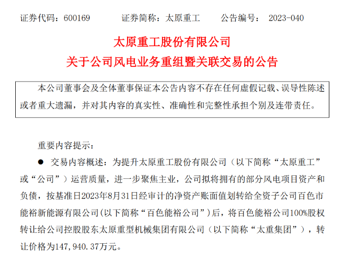 公告披露,太原重工擬將擁有的部分風(fēng)電項(xiàng)目資產(chǎn)和負(fù)債,按基準(zhǔn)日2023年8月31日經(jīng)審計(jì)的凈資產(chǎn)賬面值劃轉(zhuǎn)給全資子公司百色市能裕新能源有限公司(以下簡稱“百色能裕公司”)后,將百色能裕公司100%股權(quán)轉(zhuǎn)讓給公司控股股東太原重型機(jī)械集團(tuán)有限公司(以下簡稱“太重集團(tuán)”),轉(zhuǎn)讓價(jià)格為147,940.37萬元。