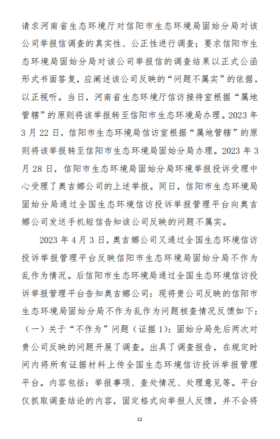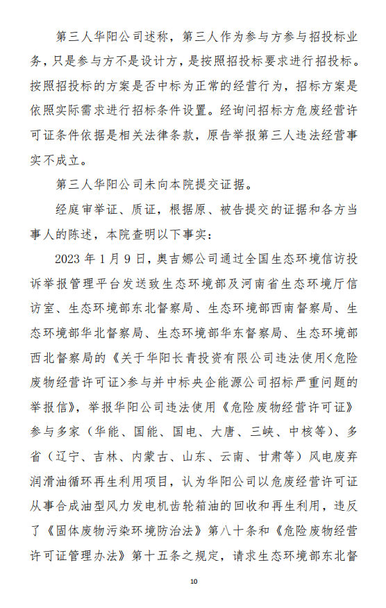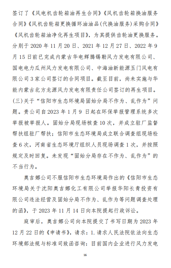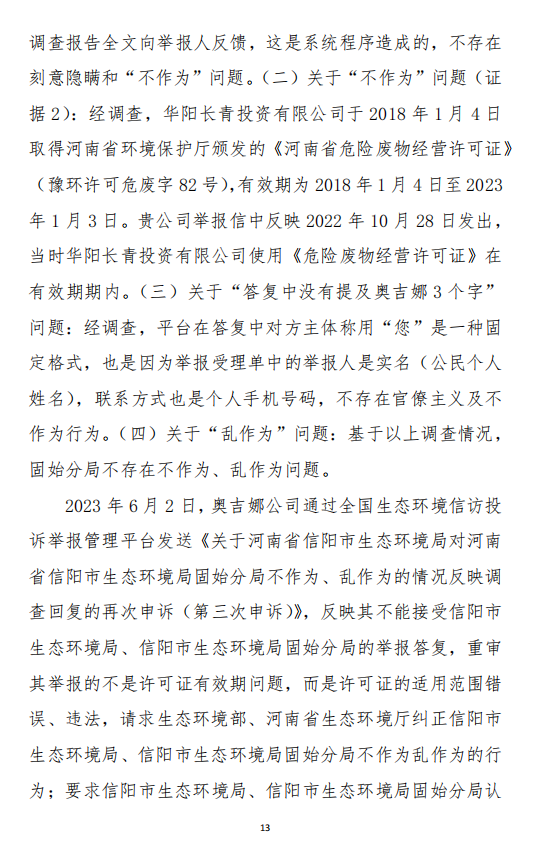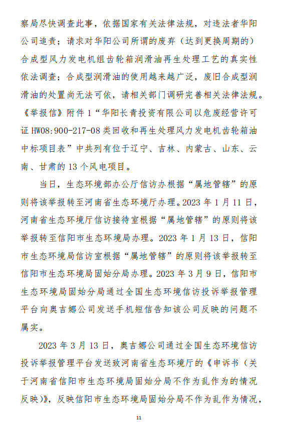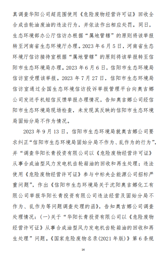 2023年3月9日,奧吉娜公司收到固始分局通過12369環(huán)境信訪平臺的短信答復(fù):“反映問題不屬實”。3月10日,奧吉娜公司向固始分局負(fù)責(zé)人電話詢問,其解釋稱:經(jīng)調(diào)查核實,華陽長青公司沒有再生風(fēng)電潤滑油銷售,出售的是新油。否定了奧吉娜公司的舉報內(nèi)容。對此,奧吉娜公司表示強烈不滿。3月11日,奧吉娜公司向環(huán)境部投訴固始分局的不作為和亂作為。2023年5月26日,奧吉娜公司收到12369環(huán)境信訪平臺的短信答復(fù)。答復(fù)部門為信陽環(huán)境局。令人啼笑皆非的是,答復(fù)稱,華陽長青的許可證有效期沒有問題,與舉報內(nèi)容風(fēng)馬牛不相及。2023年6月13日,奧吉娜公司再次向環(huán)境部提出申訴,指出,奧吉娜舉報的不是許可證有效期問題,而是許可證的適用范圍錯誤、違法。2023年7月27日,奧吉娜公司收到回復(fù)稱,經(jīng)信陽市生態(tài)環(huán)境局現(xiàn)場檢查,未發(fā)現(xiàn)固始分局不作為情況。2023年8月3日,奧吉娜公司向河南省生態(tài)環(huán)境廳(以下稱:環(huán)境廳)舉報信陽環(huán)境局包庇固始分局的行為。環(huán)境廳對此高度重視,有關(guān)處長和奧吉娜公司負(fù)責(zé)人進行了面談。2023年9月13日,信陽環(huán)境局向奧吉娜公司致《信陽市生態(tài)環(huán)境局關(guān)于沈陽奧吉娜化工有限公司舉報華陽長青投資有限公司違法經(jīng)營及固始分局不作為、亂作為等問題調(diào)查處理的函》。函中:一是,以“齒輪箱”替換“齒輪箱油”,偷換概念;二是,做出了廢風(fēng)電合成(齒輪)油不屬于危險廢物的結(jié)論;三是,未發(fā)現(xiàn)固始分局存在不作為、亂作為的不當(dāng)行為。再次否定奧吉娜公司的舉報和投訴。