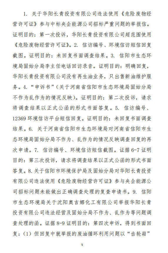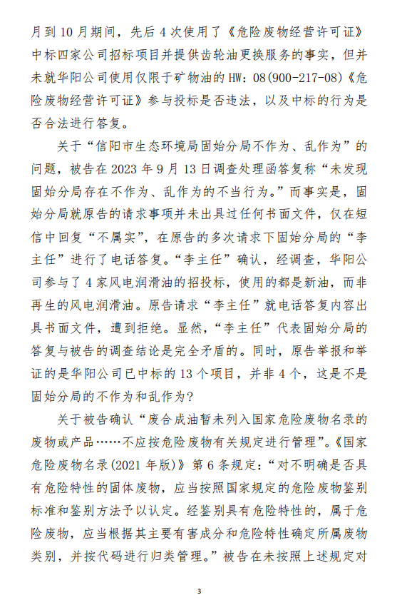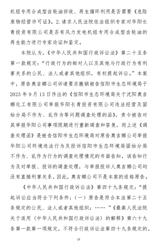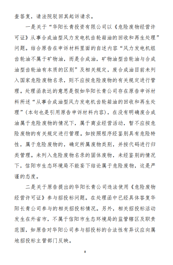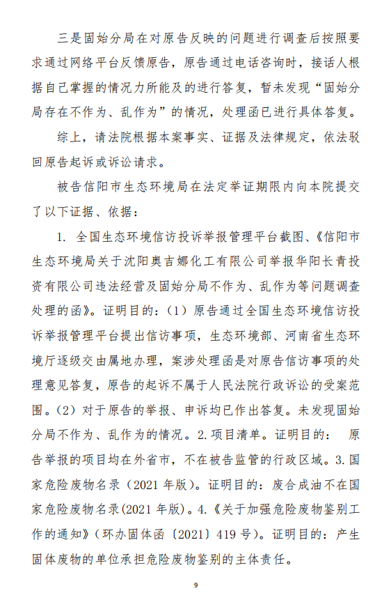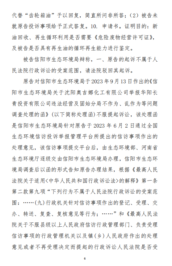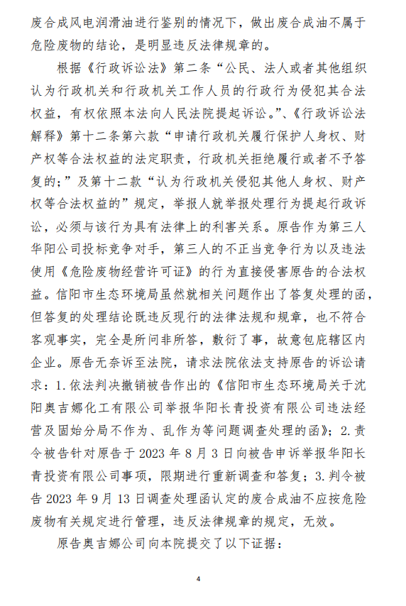 2、訴訟請求:請求人民法院判決撤銷被告作出的《信陽市生態(tài)環(huán)境局關(guān)于沈陽奧吉娜化工有限公司舉報華陽長青投資有限公司違法經(jīng)營及固始分局不作為、亂作為等問題調(diào)查處理的函》;責(zé)令被告對原告向被告舉報華陽長青投資有限公司事項,限期進行重新調(diào)查和答復(fù);判令被告認(rèn)定的廢合成油不應(yīng)按危險廢物有關(guān)規(guī)定進行管理違反法律規(guī)章規(guī)定,無效。