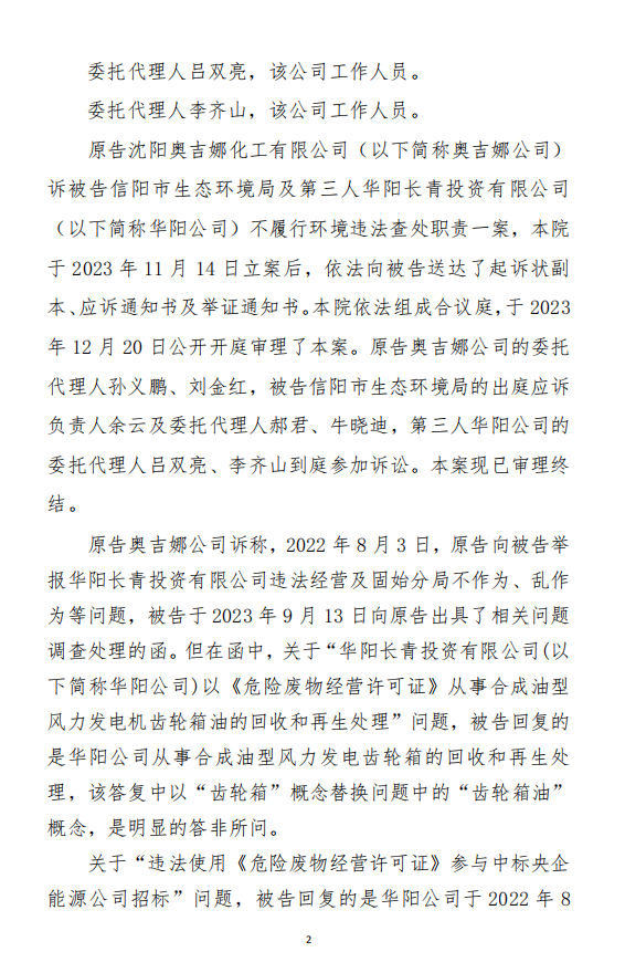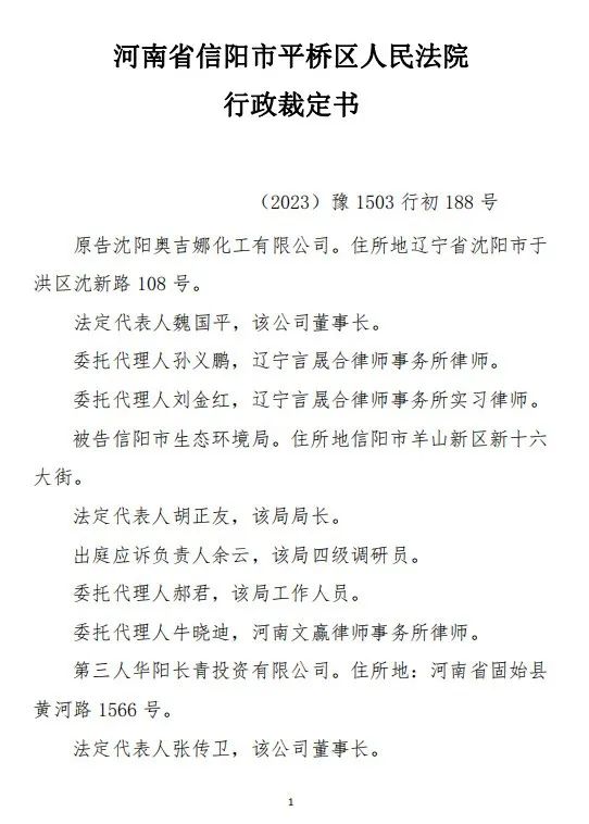 本網(wǎng)訊 中國風(fēng)電潤滑油龍頭企業(yè)沈陽奧吉娜化工有限公司(下簡稱:奧吉娜公司或原告)訴信陽市生態(tài)環(huán)境局(被告)和第三人華陽長青投資有限公司(下簡稱:華陽長青公司)行政訴訟案,河南省信陽市平橋區(qū)人民法院于2023年12月29日作出行政裁定:駁回原告沈陽奧吉娜化工有限公司的起訴。