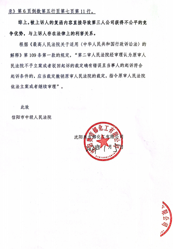 2023年12月29日,河南省信陽市平橋區(qū)人民法院裁定:駁回原告沈陽奧吉娜化工有限公司的起訴。