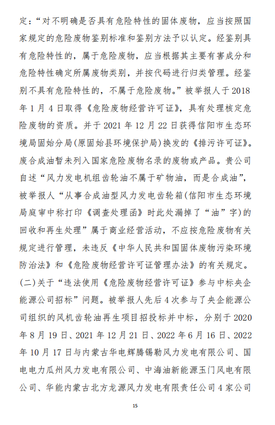 奧吉娜公司在參與各央企風(fēng)電潤滑油招投標(biāo)采購中發(fā)現(xiàn),注冊于河南省信陽市固始縣的華陽長青投資有限公司(以下稱:華陽長青公司),憑借其持有的《危險廢物經(jīng)營許可證》,屢次以“風(fēng)電齒輪油再生利用”的名義中標(biāo)。然而,奧吉娜公司發(fā)現(xiàn),華陽長青公司的《危險廢物經(jīng)營許可證》適用范圍并不包含合成型廢風(fēng)電齒輪油,屬于違規(guī)使用,涉嫌違反《環(huán)境保護法》。于是,2022年10月18日,奧吉娜公司依法向國家生態(tài)環(huán)境部(以下稱:環(huán)境部)進行舉報。按程序,舉報調(diào)查由信陽市生態(tài)環(huán)境局固始分局(以下稱:固始分局)辦理。