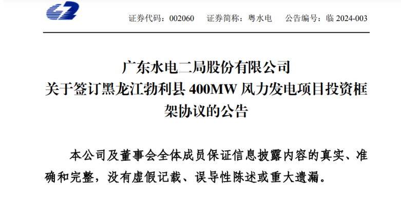 公告披露,2024 年1月11日,粵水電與黑龍江省七臺(tái)河市勃利縣人民政府(以下簡稱“勃利縣人民政府”)簽訂《勃利縣400MW風(fēng)力發(fā)電項(xiàng)目投資框架協(xié)議》。公司擬在勃利縣境內(nèi)開發(fā)裝機(jī)規(guī)模400MW風(fēng)力發(fā)電項(xiàng)目,估算總投資約20億元。