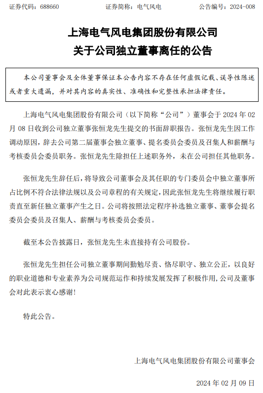 公告稱,電氣風(fēng)電董事會(huì)于2024年2月8日收到公司獨(dú)立董事張恒龍先生提交的書面辭職報(bào)告。張恒龍先生因工作調(diào)動(dòng)原因,辭去公司第二屆董事會(huì)獨(dú)立董事、提名委員會(huì)委員及召集人和薪酬與考核委員會(huì)委員職務(wù)。張恒龍先生除擔(dān)任上述職務(wù)外,未在公司擔(dān)任其他職務(wù)。