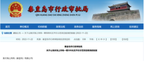 山海關(guān)海上風(fēng)電一期500兆瓦平價示范項目位于山海關(guān)區(qū)與遼冀界線海域,北鄰山海關(guān)港區(qū),向南輻射至河北省省管海域與國管海域交界附近,東側(cè)為遼冀海域分界線,西側(cè)為秦皇島港東錨地。項目建設(shè)單位為新天海上風(fēng)電(秦皇島)有限公司,風(fēng)場總?cè)萘繛?00MW,擬設(shè)計安裝單機8MW以上風(fēng)機,配建1座220千伏海上升壓站和1座陸上集控中心。項目估算總投資為62.3865億元。